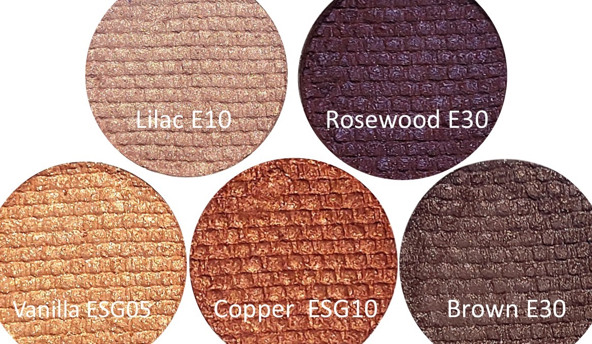 Vanilla-E10, Pink-E10, Green-E10, Purple-E10, Brown-E-20, Brown-E10, Blue-E10, Blue-E03, Blue-ESD10, Green-ESD10, Silver-ESG10, Peach-E10, Nude-E10, Nude-E20, Copper-ESG10, Brown-E30, Rosewood-E30, Lilac-E10, Gold-HL20, Silver-HL20, Orange-E20, Champagne-ESG08