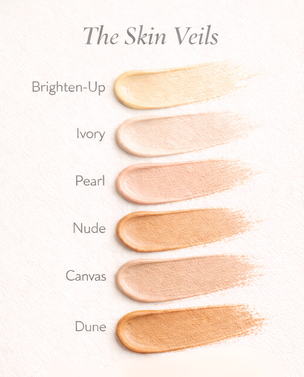De overige veils zijn verkrijgbaar in verschillende huidtinten — van Ivory, Pearl, Nude, Canvas tot Dune — elk ontworpen om de teint zacht te perfectioneren door poriën optisch te verfijnen, de huidtoon egaler te laten lijken en subtiele warmte en natuurlijke diepte toe te voegen waar nodig.