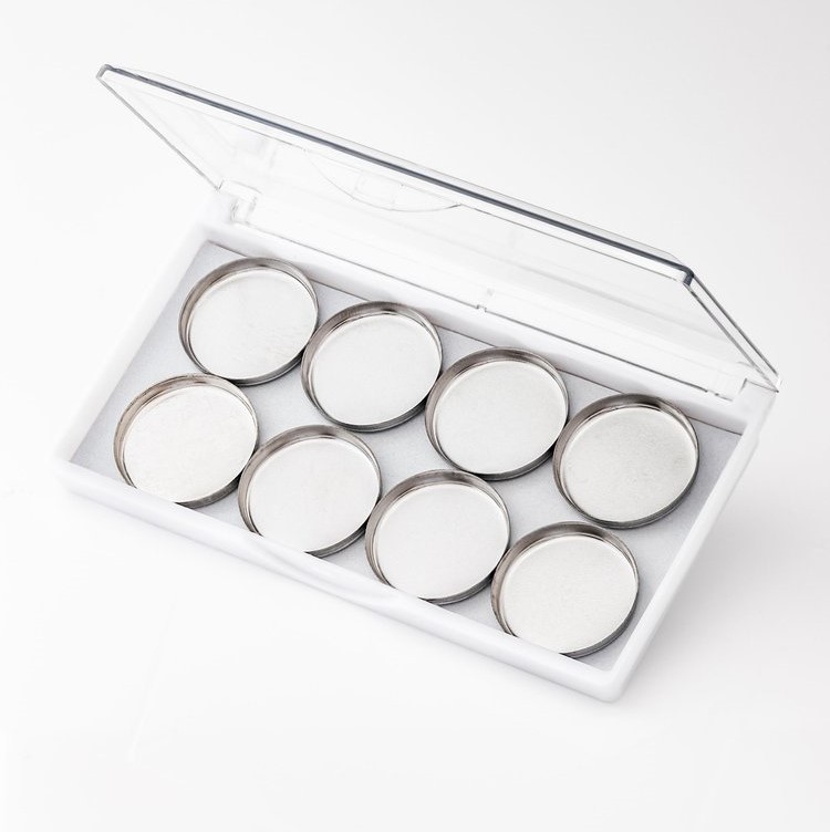 - Ronde pannetjes: 8 x 26mm (geschikt voor Puréz geperste oogschaduws, wenkbrauwpomades en cake eyeliners).